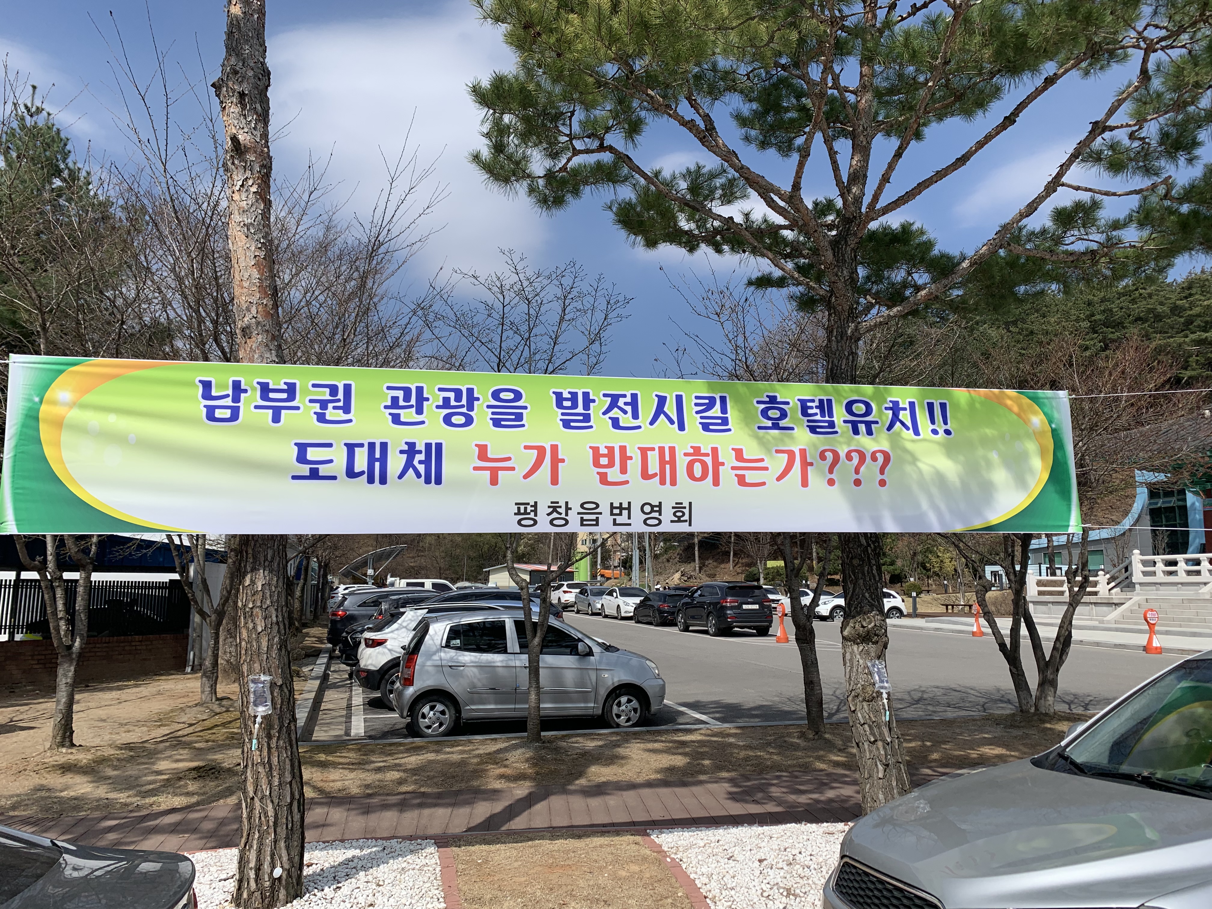 평창읍 번영회를 중심으로 평창읍 소속 20여 개 사회단체들은 지난 7일 시내 곳곳에 평창읍 관광숙박시설유치 환영 현수막 30여 점을 일제히 내걸며 평창읍 주민들의 환영의사를 내비쳤다.