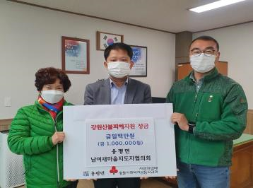 지난(4.15) 용평면 새마을회(협의회장 최기철, 부텨회장 정해옥)는 면사무소를 방문해 산불로 큰 피해를 입은 동해안 지역주민들을 돕기 위해 성금 100만원을 기탁하였다. 최기철 협의회장 및 정해옥 부녀회장은 “코로나19로 어려움을 겪고 있는 와중에 화재로 삶의 터전까지 잃어버린 산불 피해주민들이 일상생활이 가능하도록 도움이 되길 바란다.”고 전하였다.