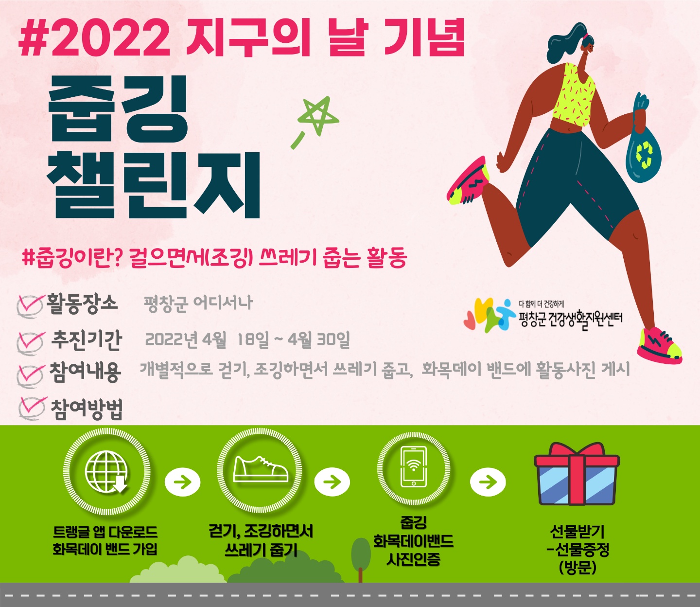 평창군건강생활지원센터에서는 지구의 날을 맞아 주민들과 함께하는 ‘건강도 챙기고 환경도 챙기는 줍깅 챌린지’를 개최한다고 밝혔다.