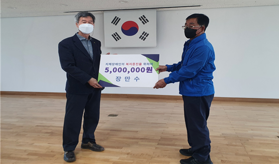 4월 20일 장애인의 날을 맞이하여 사)강원도지체장애인협회 평창군지회 장만수 지회장이 코로나 장기화로 지쳐있던 지역내 지체장애인들의 나들이, 체험활동, 프로그램 활동 등 지원사업비로 500만원을 평창군지체장애인협회에 기탁했다.