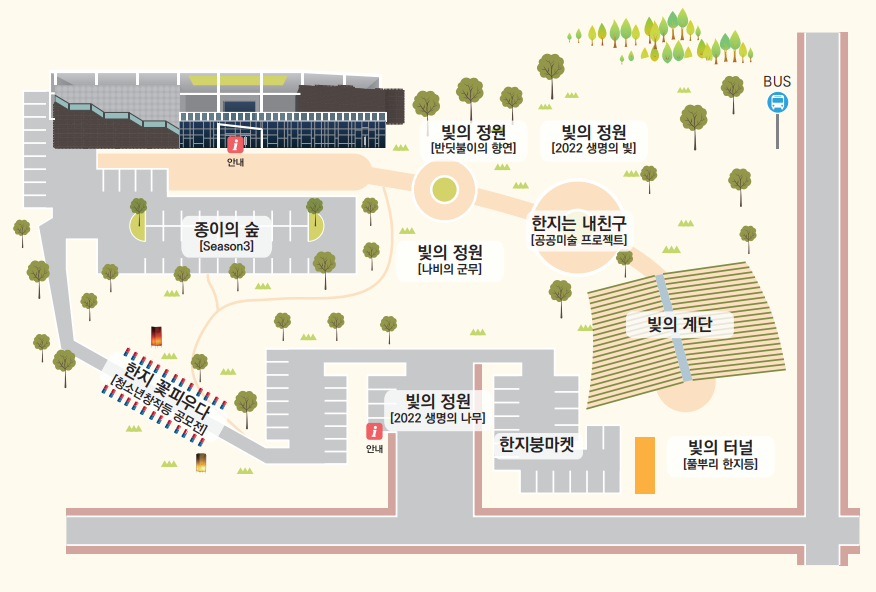 둘째, 축제의 오프라인 플랫폼인 ‘원주한지테마파크’에서는 빛과 한지의 다양한 설치미술과 미디어 아트, 4,000명 이상의 유아와 청소년이 제작한 한지등 전시, 3,000명 이상이 평화를 소망하며 참여한 공공미술 프로젝트 <한지는 내 친구>, 한지작가의 등용문 <대한민국한지대전>이 전시된다. 올해 22번째를 맞는 <대한민국한지대전> 전시는 오프라인뿐만 아니라 온라인에서도 3D로 전시된다.