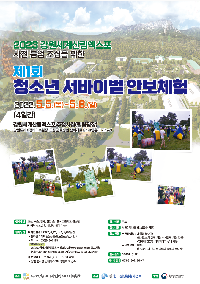 (재)강원세계산림엑스포조직위원회(사무처장 전길탁)는 오는 5월 5일부터 5월 8일까지 4일간 2023 강원세계산림엑스포 사전 붐업 조성을 위한 「제1회 청소년 서바이벌 안보체험」을 엑스포 주행사장인 강원도 세계잼버리수련장에서 개최한다고 밝혔다.