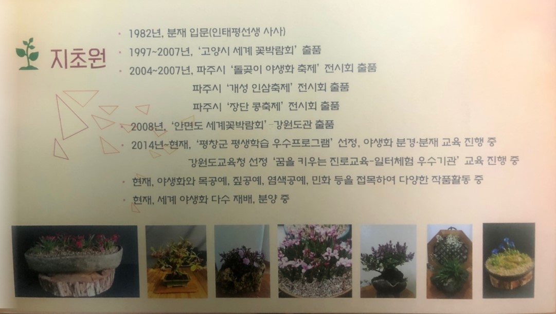 그리고, 2022년 4월, 형형색색의 봄꽃이 산천을 뒤덮은 지난 화요일, 야생화, 작은 나무 분경 전시회가 열리는 봉평면의 지초원을 찾았다. 봉평면 지초원에는 이제 막 세계 여러 나라의 야생화가 아기자기하게 피어나고 있었다. 야생화 분경 전시회장 안에서 지초원 전은자 대표를 만났다.