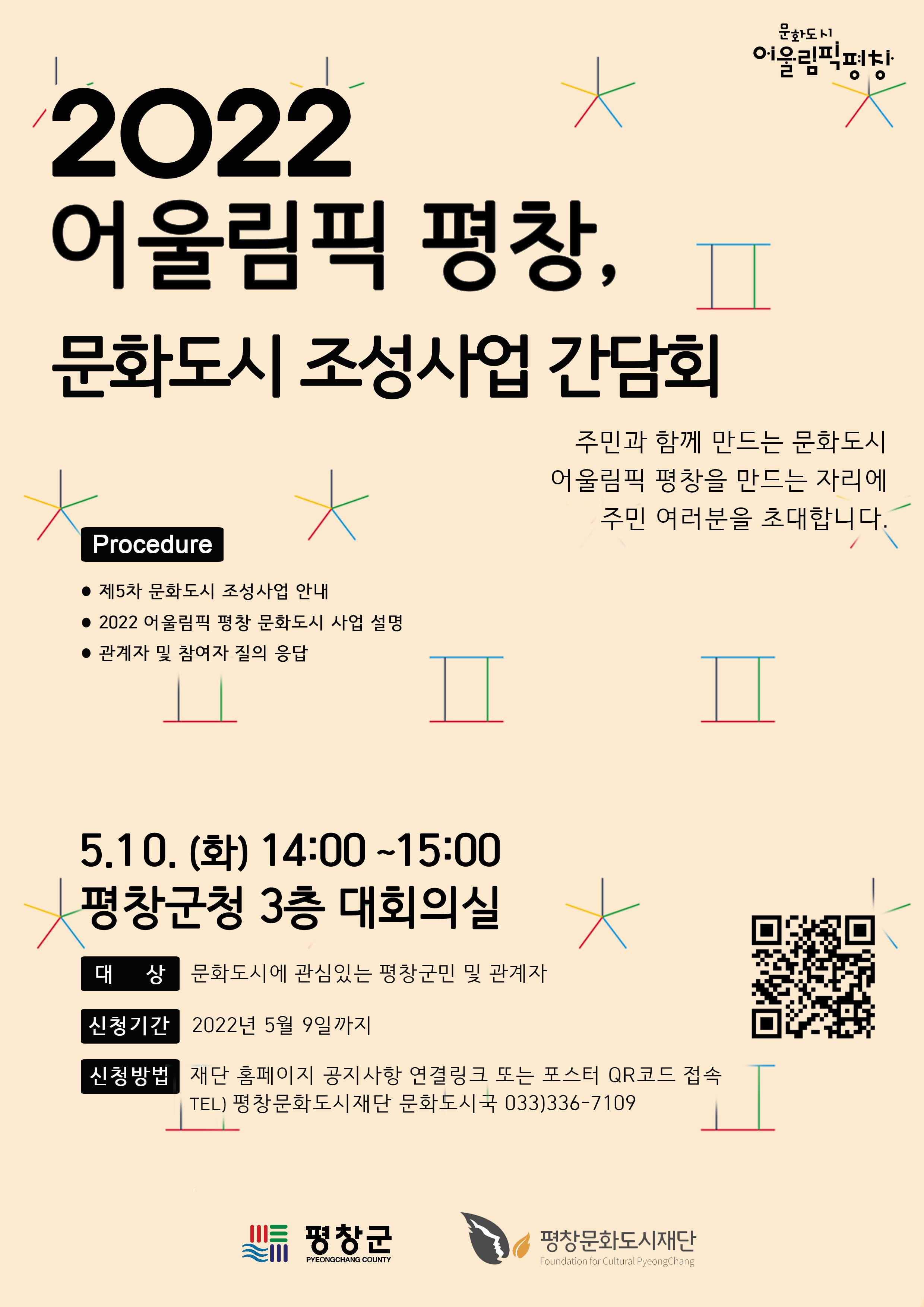 평창군과 (재)평창문화도시재단(이사장 김도영)은 10일(화) 오후 2시 군청 대회의실에서 지역 주민들을 대상으로 2022년 평창 문화도시 조성사업 간담회를 개최한다. 이번 설명회는 문화체육관광부에서 추진하는 제5차 문화도시 공모사업 및 평창 문화도시 조성을 위해 준비하고 있는 추진사업을 안내하고 사업의 취지 및 목적에 대한 이해를 높이기 위하여 마련했다.