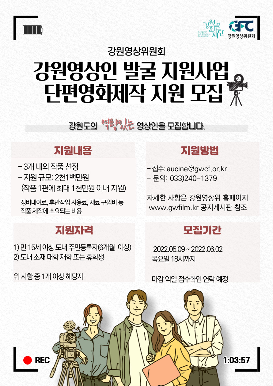 ‘강원영상인 발굴·지원사업’은 도내 거주 영상인 및 대학 재·휴학생들을 대상으로 한 사업으로, 제작 과정에서 소요되는 제작비용을 지원하는 사업이다. 올해는 총 2천1백만원의 지원 규모 내에서 심의를 거쳐 작품당 최대 1천만원 이내 차등 지원할 계획이다.