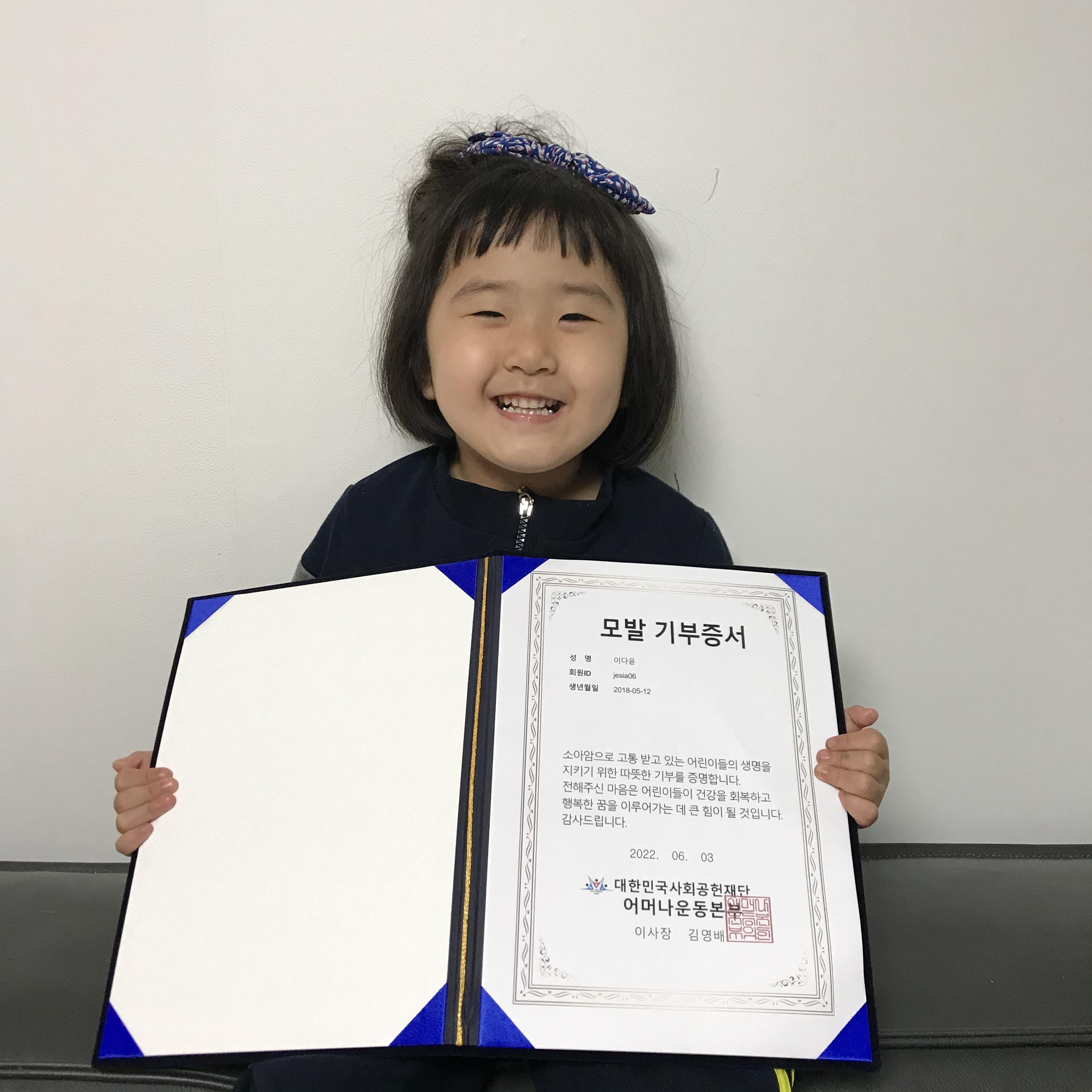 다윤양 어머니 고나선씨는 “5살 아이의 머리카락을 한 올 자르기 아까워 고이 길러온 배냇머리로 2022년 5월 12일 아이의 다섯 번째 생일을 맞아 어느 한 소중한 작은 생명에게 꺼지지 않는 희망의 불씨이길 바라며 작은 마음을 전한다.”고 기부 소감을 밝혔다.
