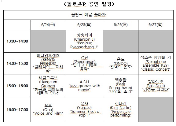 평창국제평화영화제가 영화제 기간 펼쳐질 다양한 거리공연 ‘팔로우P’ 12팀의 라인업을 공개했다. 올림픽메달플라자에서 진행되는 거리공연 ‘팔로우P’는 국악, 재즈, 대중음악, 어쿠스틱, 클래식, 마임 등 다채로운 장르의 팀으로 구성됐으며, 영화제 기간인 6월 24일(금)부터 27일(월)까지 다양한 장르의 공연을 즐길 수 있다.