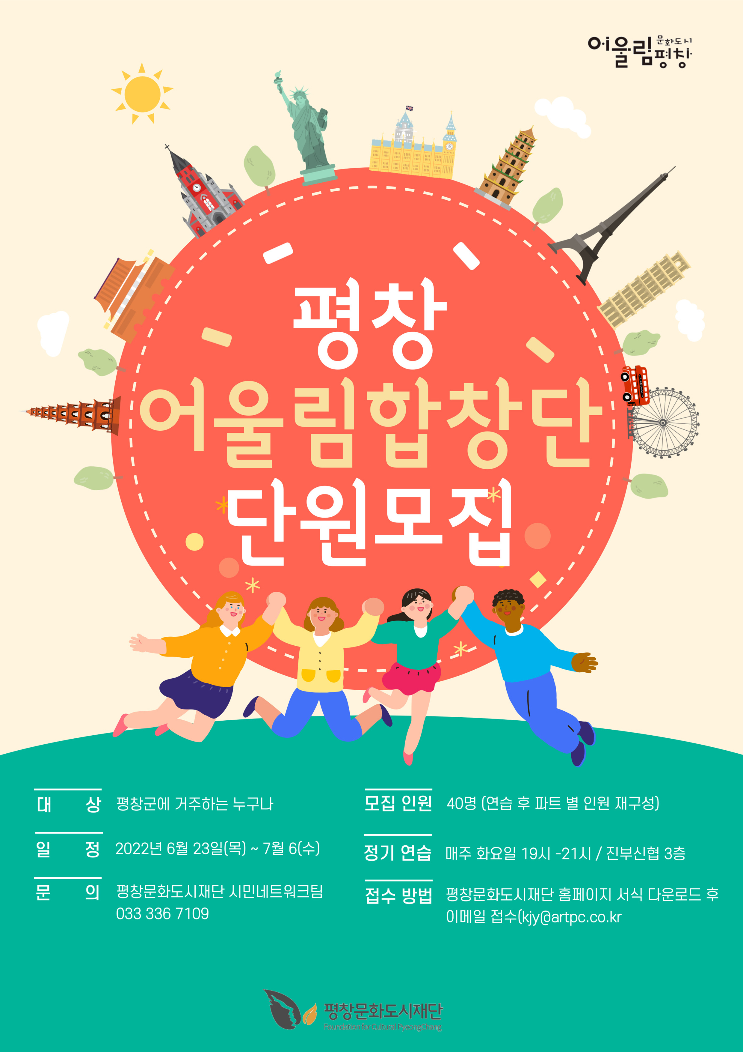 평창군에 거주하는 누구나 지원이 가능하며, 모집분야는 소프라노, 메조 소프라노, 앨토 등이다. 실기 오디션은 자유곡 1곡 시장 및 음역 테스트 등으로 진행될 예정이다. 어울림 합창단원으로 선발되면 매주 이루어지는 정기연습과 특별연습을 비롯해 관내/외 초청공연 등 다양한 활동에 참여하게 된다. 지원 방법은 (재)평창문화도시재단 홈페이지에 게시된 모집 공고문 확인 후 서식을 다운로드 하여 이메일(kjy@artpc.co.kr)로 접수하면 된다.
