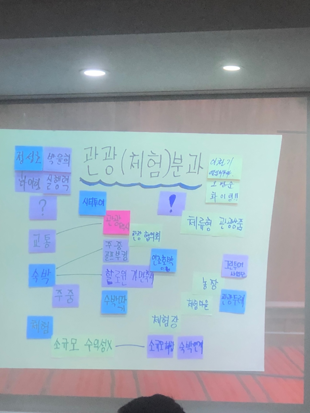 관광 체험분과 하면서 앞에서 연결해서 묶어서 그게 홍보분과로 넘어갈 것 같다. 체험분과의 문제점과 해답에 대하여 이야기 나누어 보았다. 문제점은 교통의 문제가 있다. 이걸 어떻게 풀면 될까? 시티투어 관광택시와 연결하면 좋겠다. 실제 숙박업 분들이 이런 교통 예약, 활용법에 대한 숙지가 안 된 부분이 있는데 지역의 숙박업에 종사하는 분들이 지역관광 네트워크 교통 숙박 등에 대한 정보를 많이 알면 좋겠다. 숙박 같은 경우에는 주중에 숙소가 안찬다. 40~70대 중년층이 많은데 중년층들이 골프 부킹을 해 주는 방법, 지역 골프 연결, 군이나 관광협의회에서 기업체와 협력 등 관광상품과 숙박업소를 연계하는 방법도 좋을 것 같다.