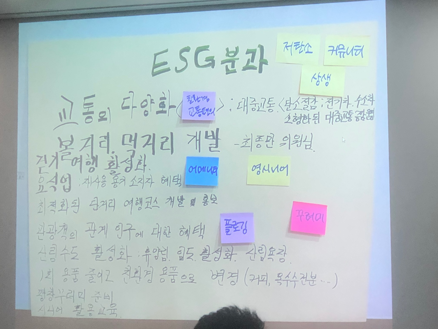 숙박업소에 들어가는 1회용 용기가 안 쓰고 버려지는 경우가 많은데 평창에서 획기적으로 변화될 수 있는 방안에 대한 고민, 지역의 농산물, 작물, 여행상품관 등 고부가가치의 상품을 개발해서 지역에서 상생할 수 있는 방안에 대한 고민, 플로킹이라고 하는 선자령에 휴지를 주우면서 가치 있는 여행을 할 수 있는 방안, 음식도 친환경 밥상으로 일반적으로 먹는 밥상 이외에 친환경 밥상 등을 선도적으로 만드는 방법에 대한 고민이 필요하다.
