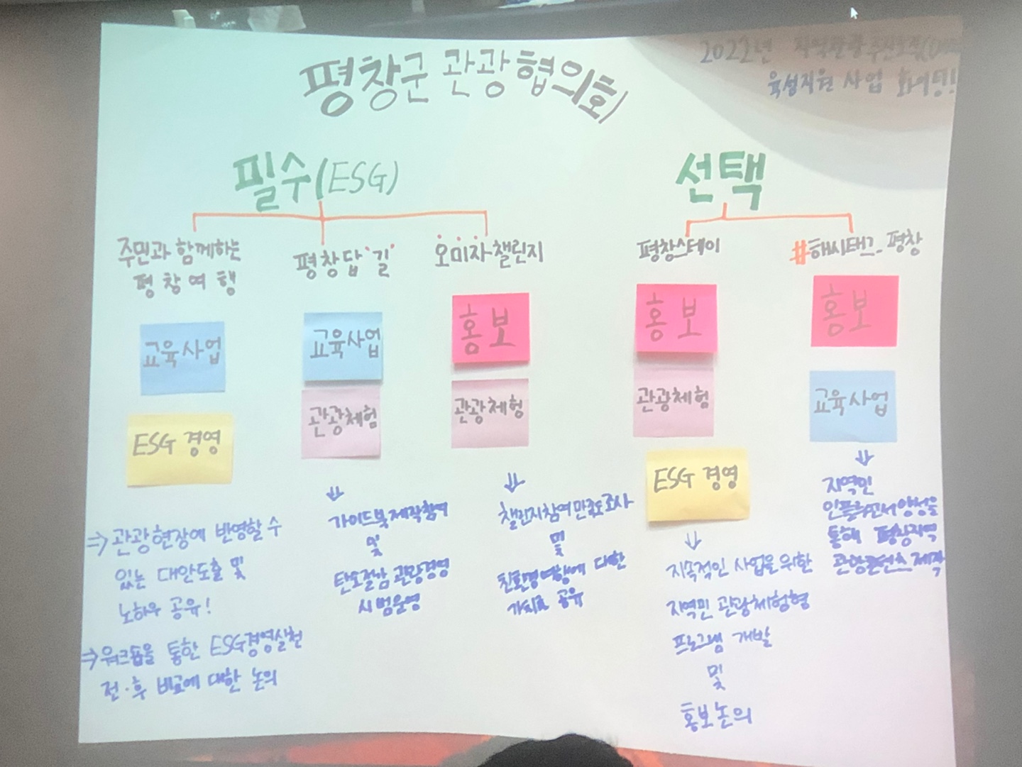 평창DMO협력 거버넌스 구축을 위한 토론 제안에서 ESG 경영분과에는 친환경 여행의 정립 방안, 평창 걷기 여행 활성화 방안, 평창의 생태적 가치 및 환경 보존 방안, 1회용품 사용 감소 방안, 지역상생화 지속가능 관광방안, 평창지역 관광객의 지역시민화 방안, 로컬푸드, 지역 소비 촉진 방안, 평창지역 리조트 및 관광기업 친환경 시스템 구측 등에 대한 토론을 제안했다.