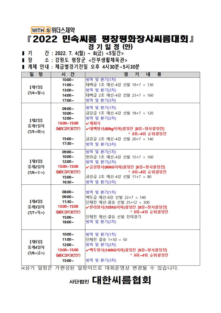 관계자는 "무료관람이 가능한 이번 2022 민솔씨름 평창평화장사씨름대회'에  주민분들의 많은 관심 부탁드립니다."고 말했다.