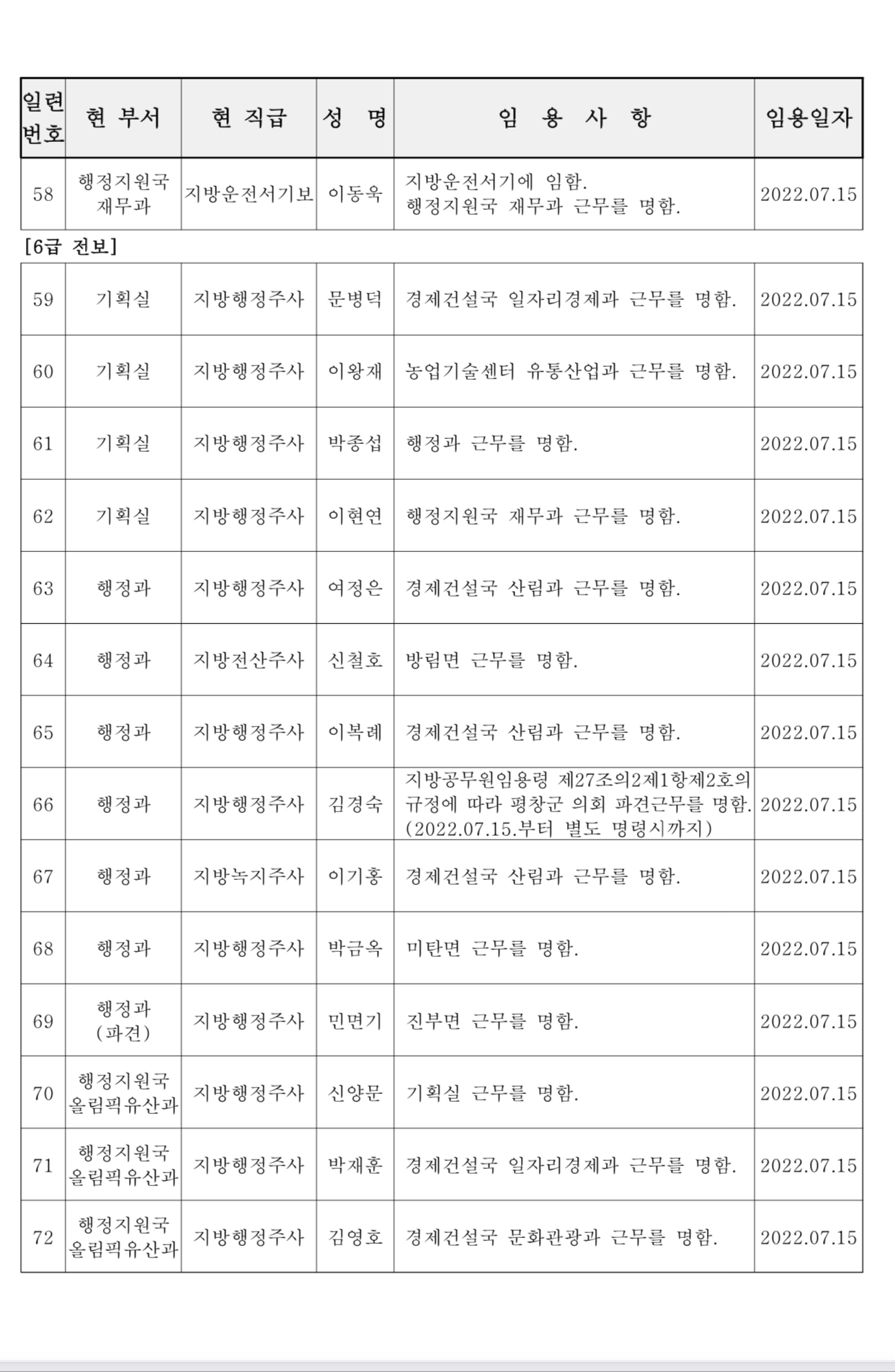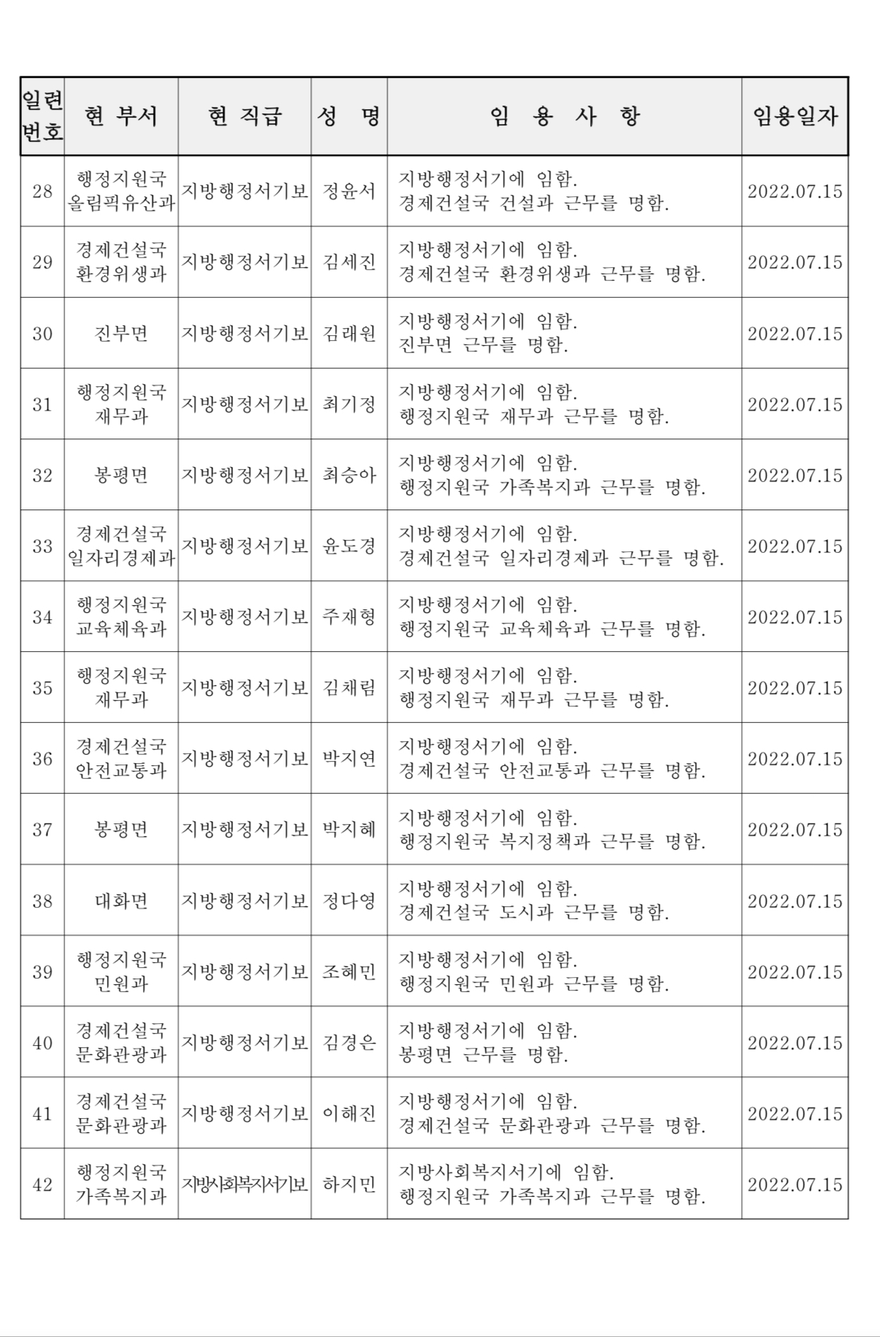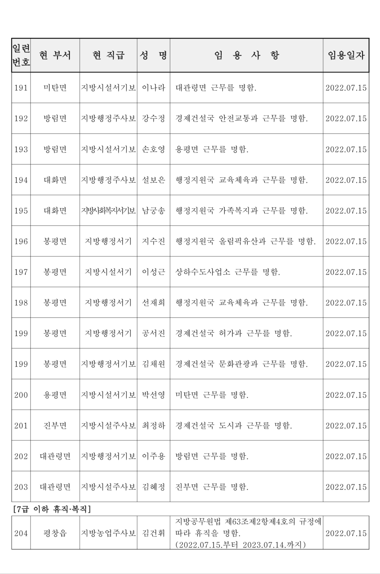 이번 인사는 필수보직기간 이상 근무자, 신규 공무원의 업무경험 향상을 위한 본청·읍면간 순환전보, 지원부서와 사업부서간 균형있는 인력 배치, 격무부서 근무자 우대 등을 최우선으로 고려하여 6급 이하 직원 211명을 승진 및 전보했다.