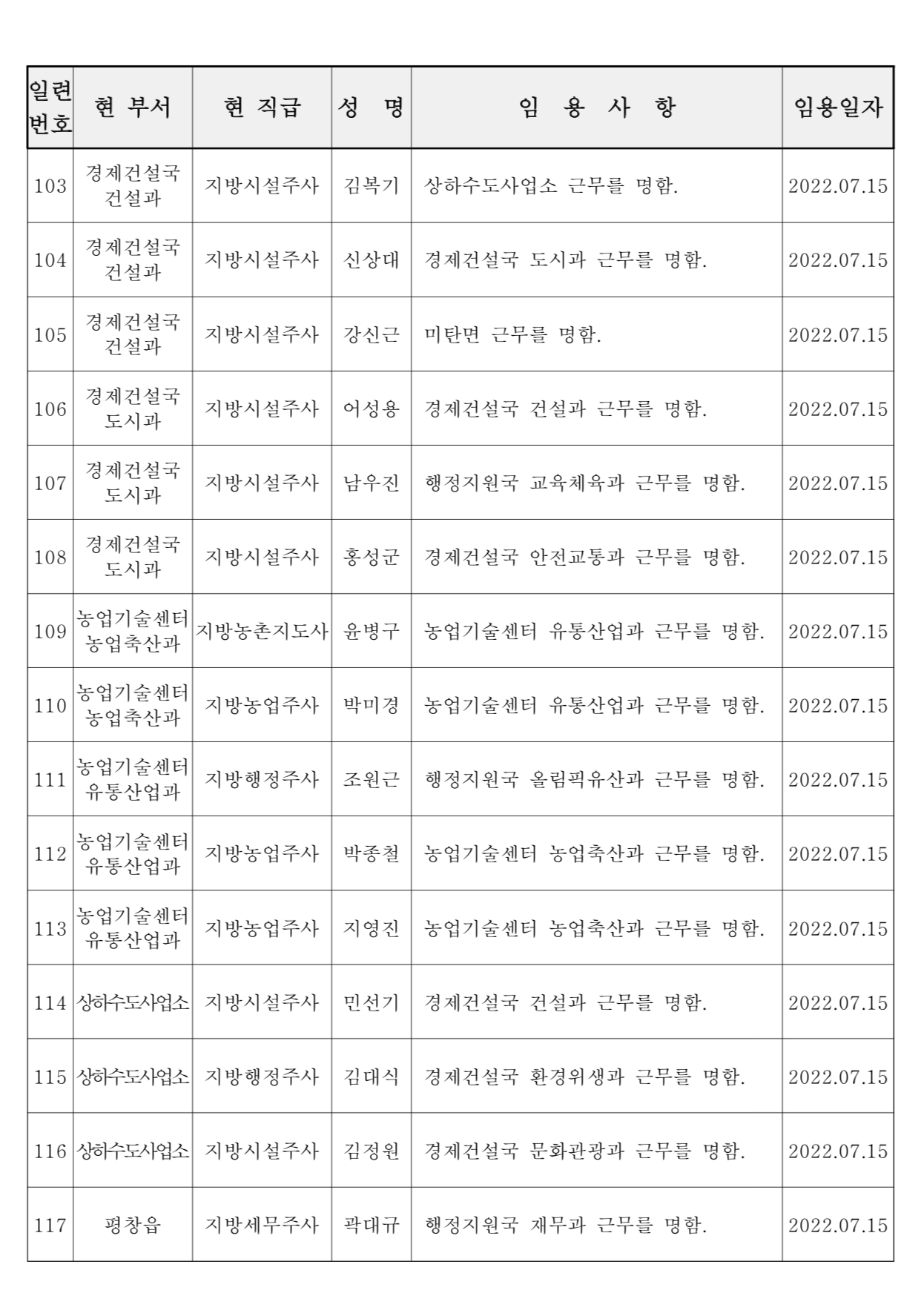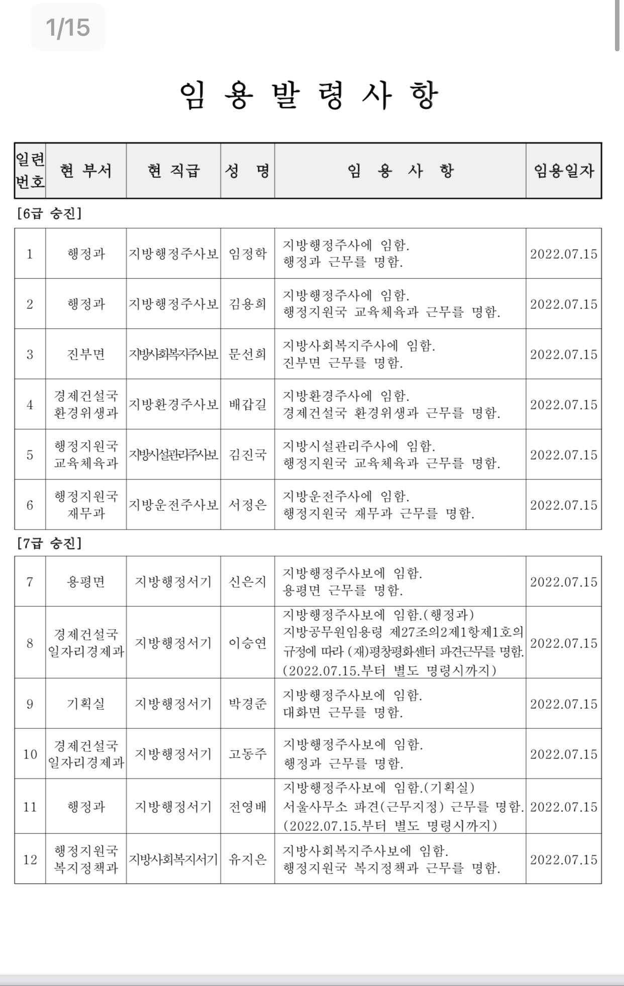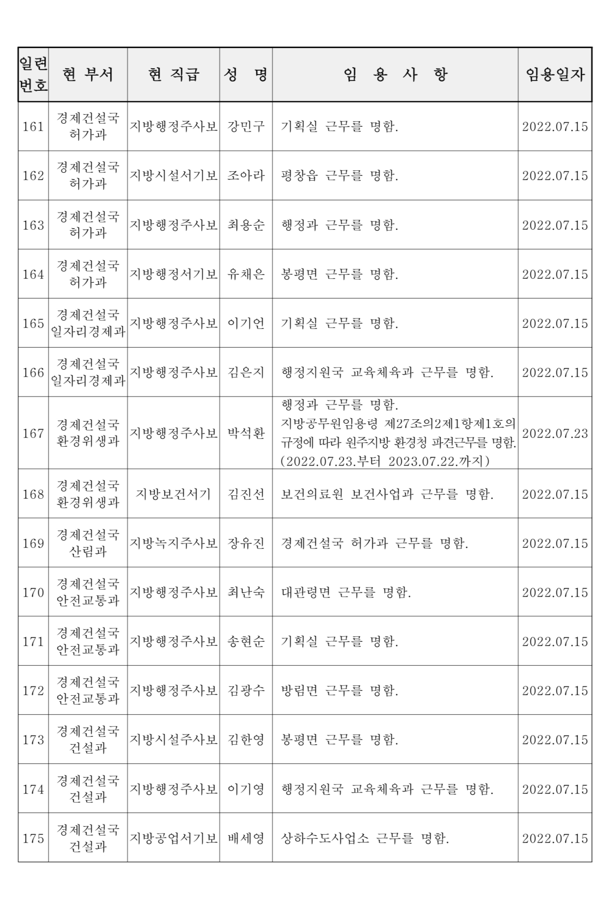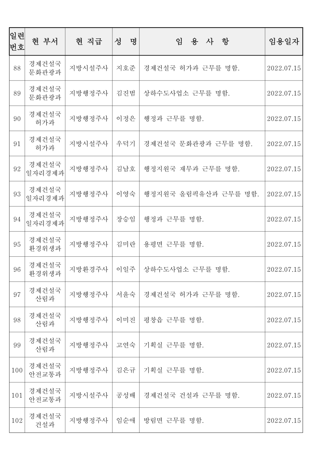 이번 인사는 필수보직기간 이상 근무자, 신규 공무원의 업무경험 향상을 위한 본청·읍면간 순환전보, 지원부서와 사업부서간 균형있는 인력 배치, 격무부서 근무자 우대 등을 최우선으로 고려하여 6급 이하 직원 211명을 승진 및 전보했다.