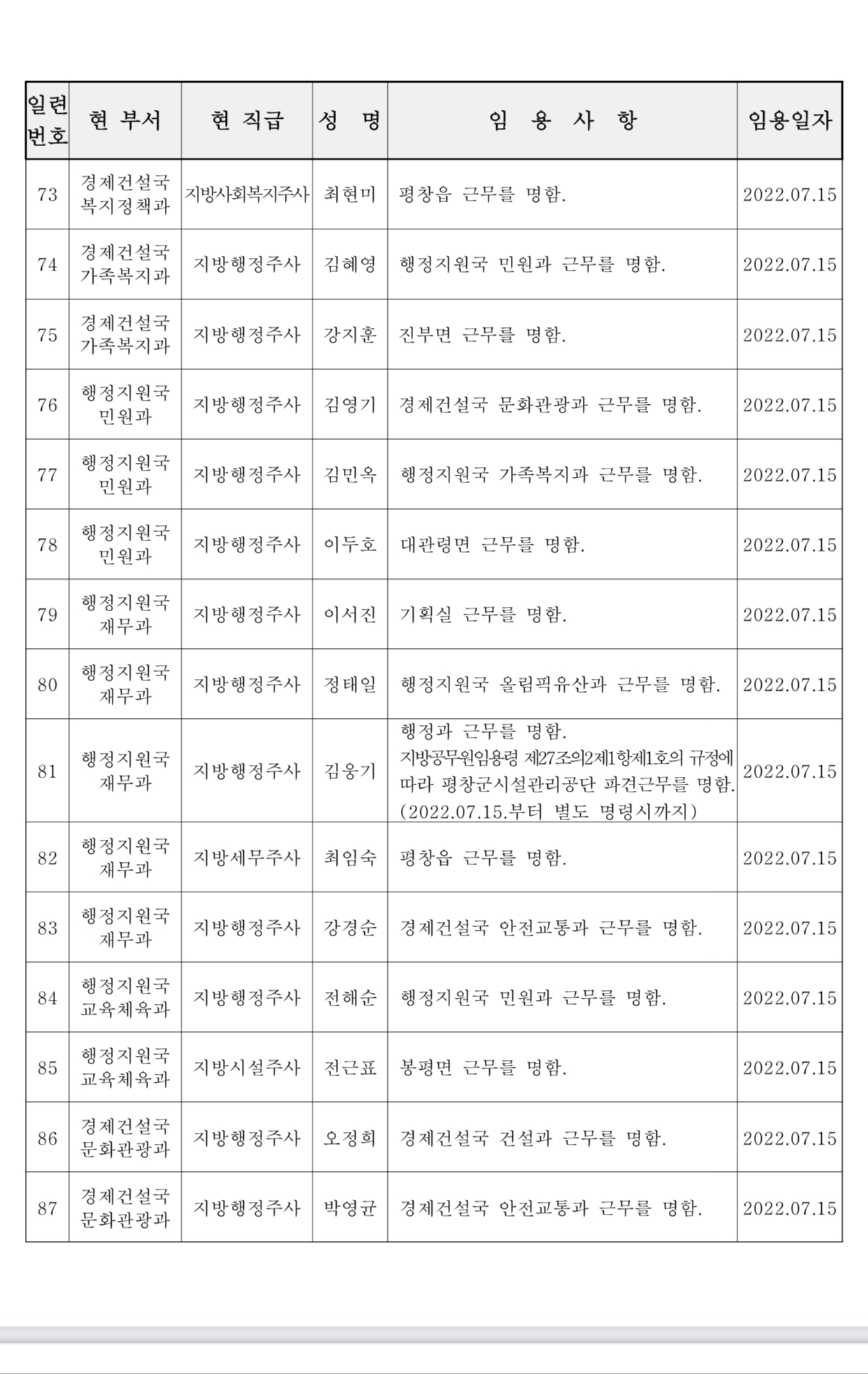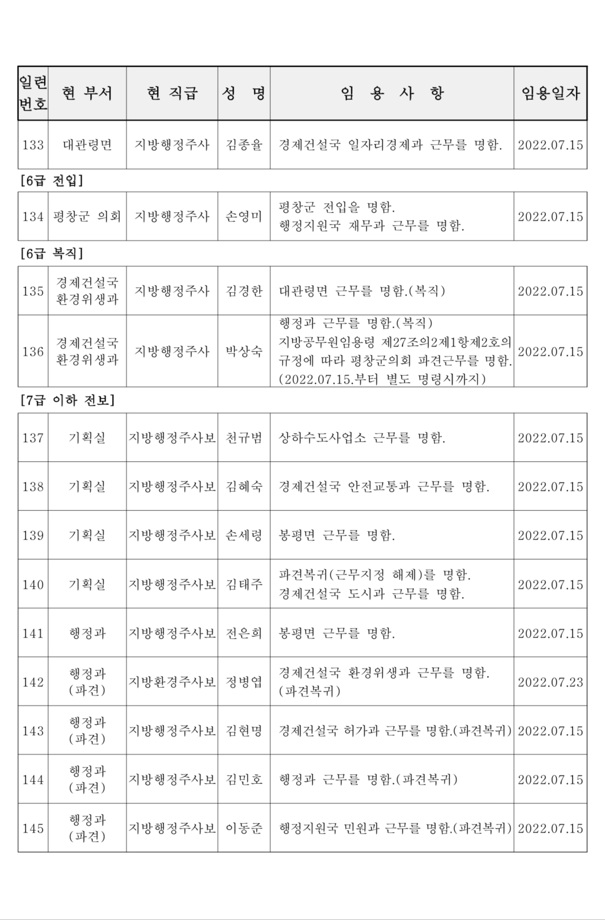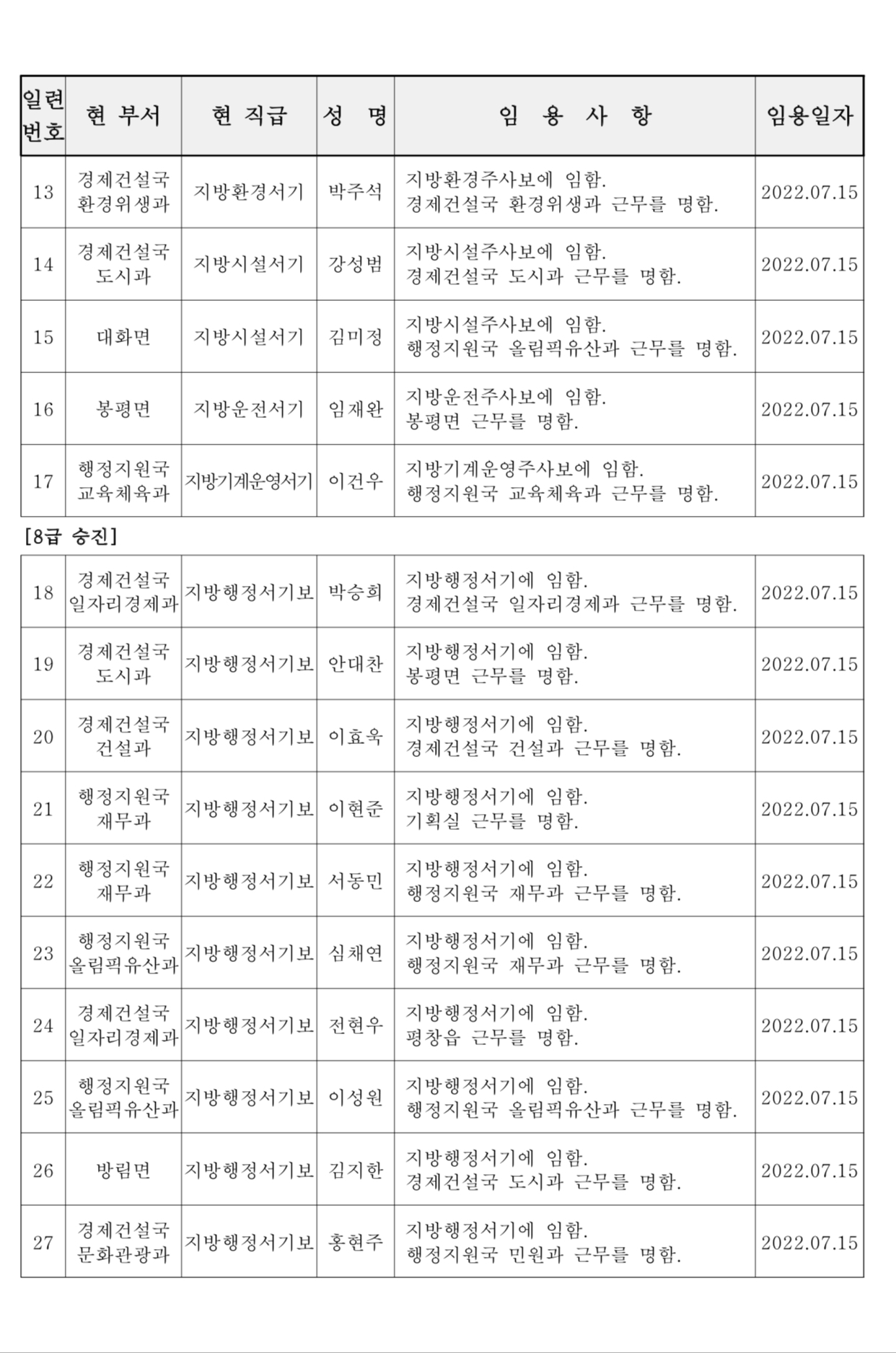 평창군은 15일, “하나된 평창, 행복한 군정” 슬로건 아래 민선8기 군정의 성공적 출범을 위한 첫 정기인사를 단행했다.