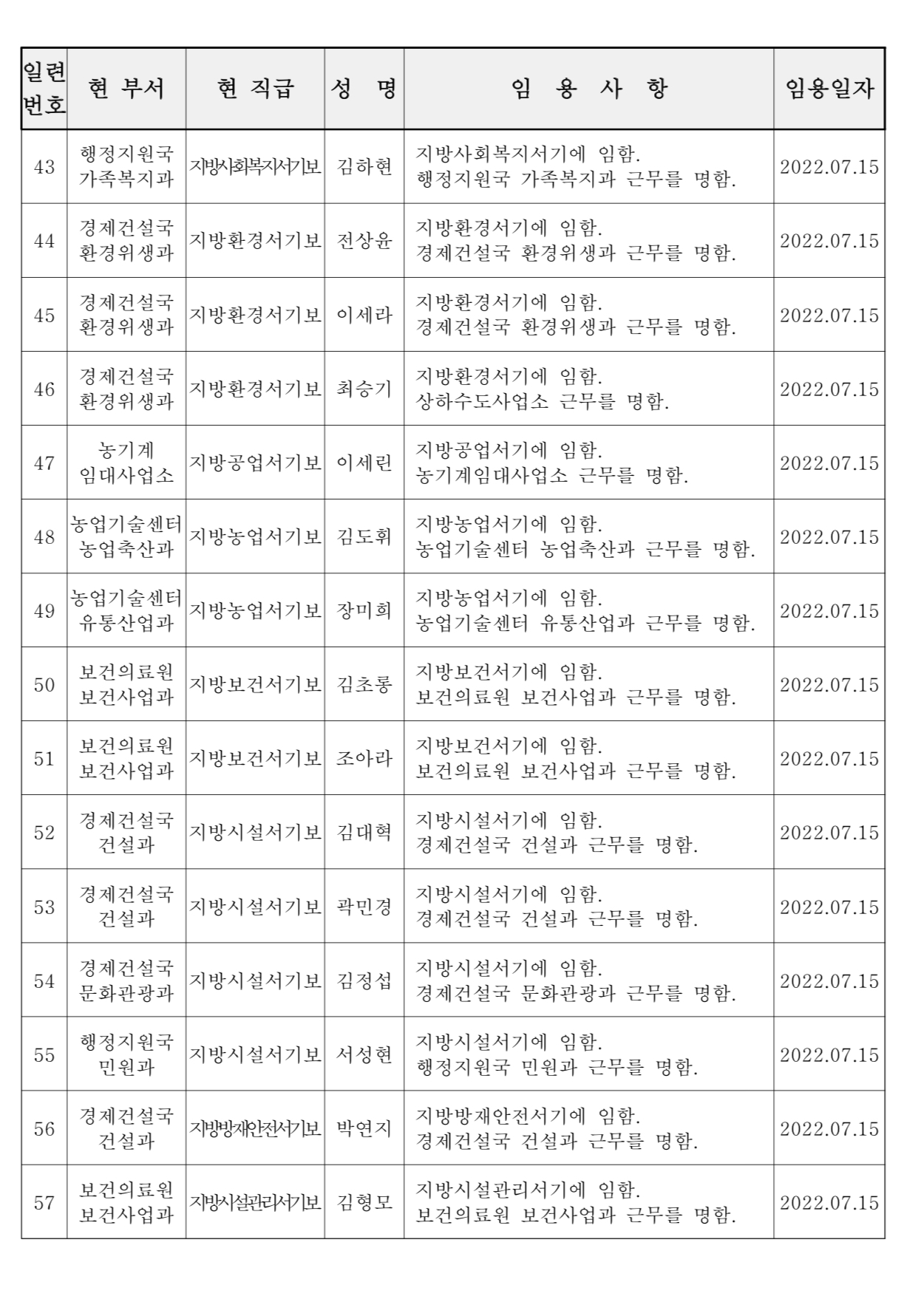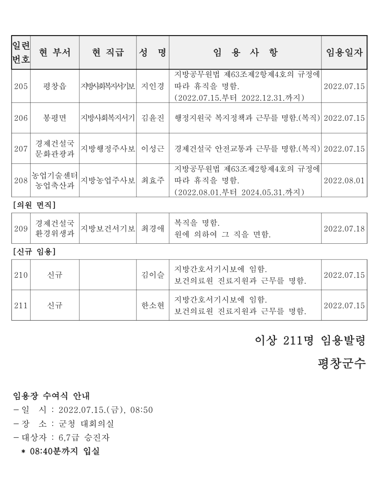 이번 인사는 필수보직기간 이상 근무자, 신규 공무원의 업무경험 향상을 위한 본청·읍면간 순환전보, 지원부서와 사업부서간 균형있는 인력 배치, 격무부서 근무자 우대 등을 최우선으로 고려하여 6급 이하 직원 211명을 승진 및 전보했다.