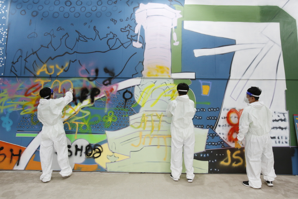 강원작가트리엔날레2022의 사전 붐업 행사의 일환으로 진행된 이번 워크숍에는국내 최정상 그래피티 작가인 제바(XEVA) 유승백씨와 평창 진부중학교 2학년 학생 100여 명이 차례로 참여해 대형 그래피티를 완성했다.