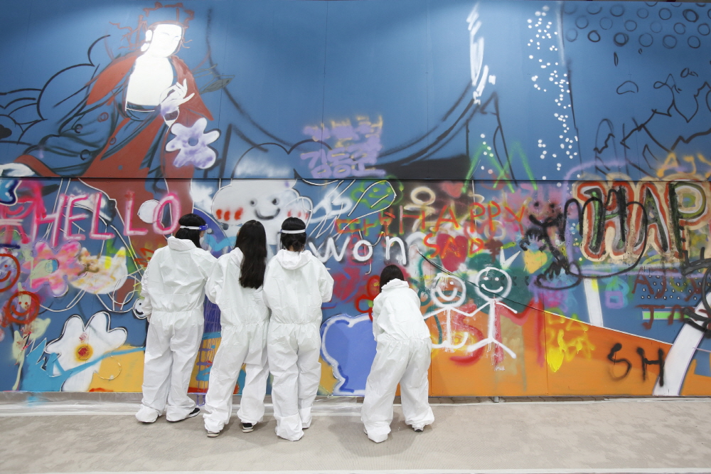 진부중학교 2학년 3반 염정연 학생은 “그래피티라는 것을 오늘 처음 알았는데 스프레이를 뿌려서 그림이 되어가는 모습이 신기했고, 월정사에 전시된다는 사실이 믿기지 않는다”라며 “각자 원하는 것을 그리다 보니 이게 작품이 될까 생각했지만 작업을 끝내고 보니 우리들만의 독특한 느낌이 담겨 있어서 뿌듯했다”고 소감을 밝혔다.