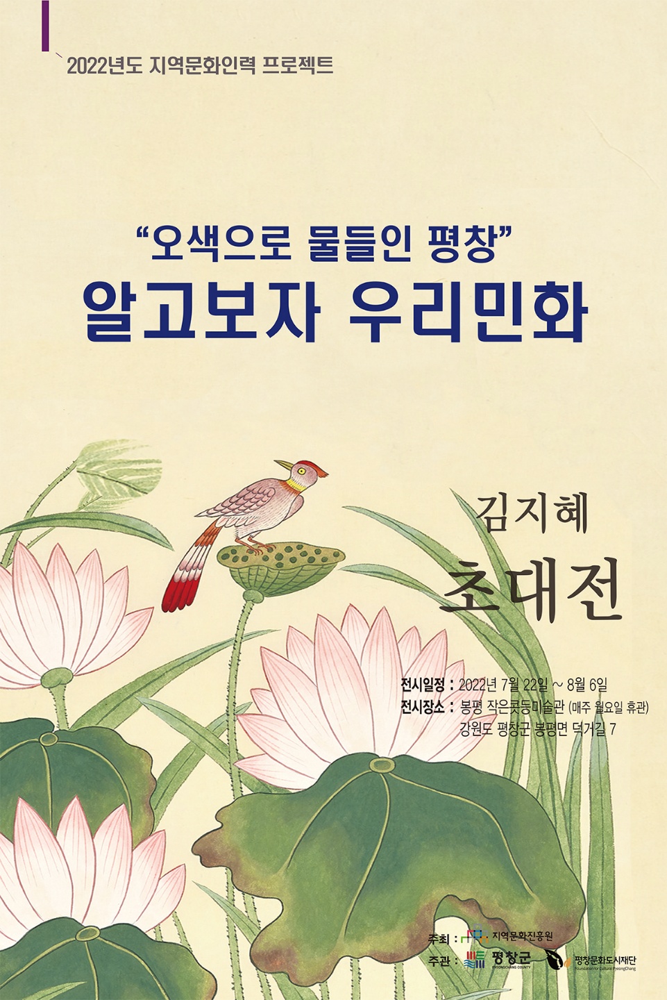 평창군과 평창문화도시재단은 민화라는 한길을 걸어온 김지혜 작가의 초대전 오색으로 물들인 평창722일부터 86일까지 봉평 콧등작은미술관에서 열린다고 밝혔다.