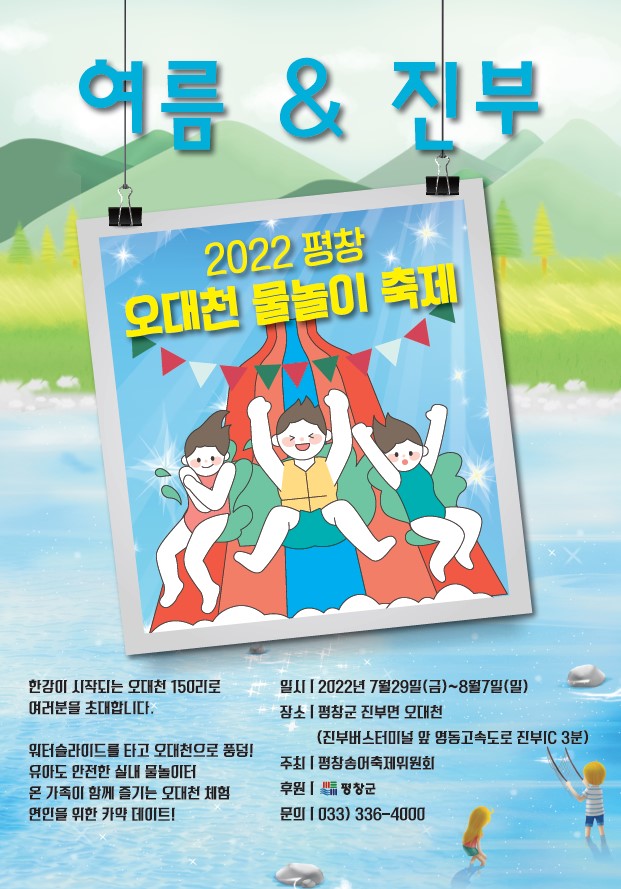 겨울 평창송어축제와 가을 김장 축제로 ‘관광 진부’ 시대를 열어 온 진부면이 ‘여름& 진부’를 슬로건으로 ‘2022 평창 오대천 물놀이 축제’를 7월 29일(금)부터 8월 7일(일)까지 연다.