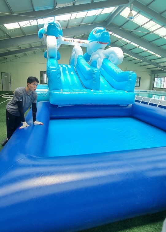 오대산천축제위원회에서 물놀이 축제 어린이용 실내 풀을 완성하고 있다. 오대천물놀이축제에서 에어바운스 시운행을 하고 있다.