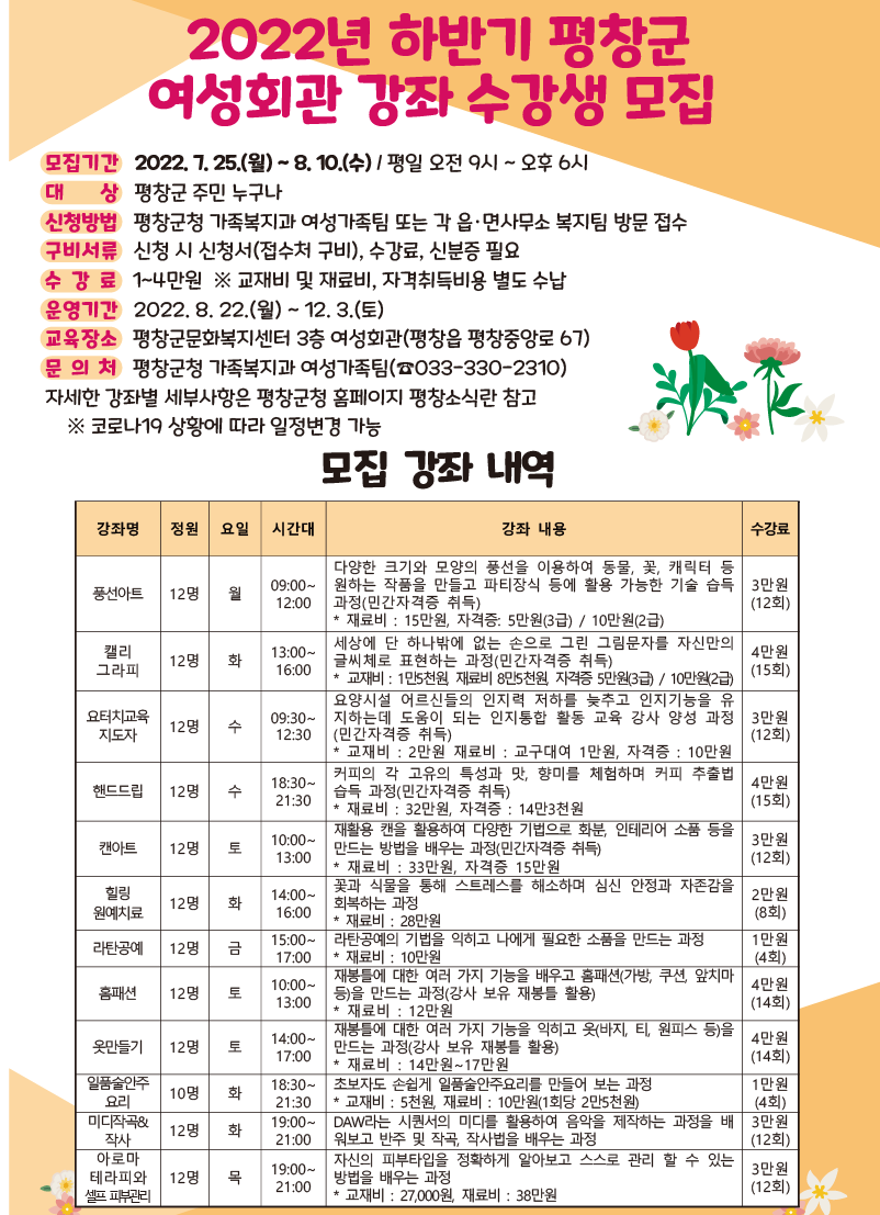 평창군은 오는 25일부터 810일까지 2022년 하반기 여성회관 강좌 수강생을 모집한다.