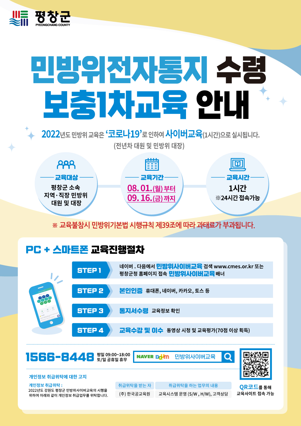 평창군은 오는 8월 1일부터 9월 16일까지 2022년 민방위대원 사이버교육 보충교육(1차)을 실시한다고 밝혔다.