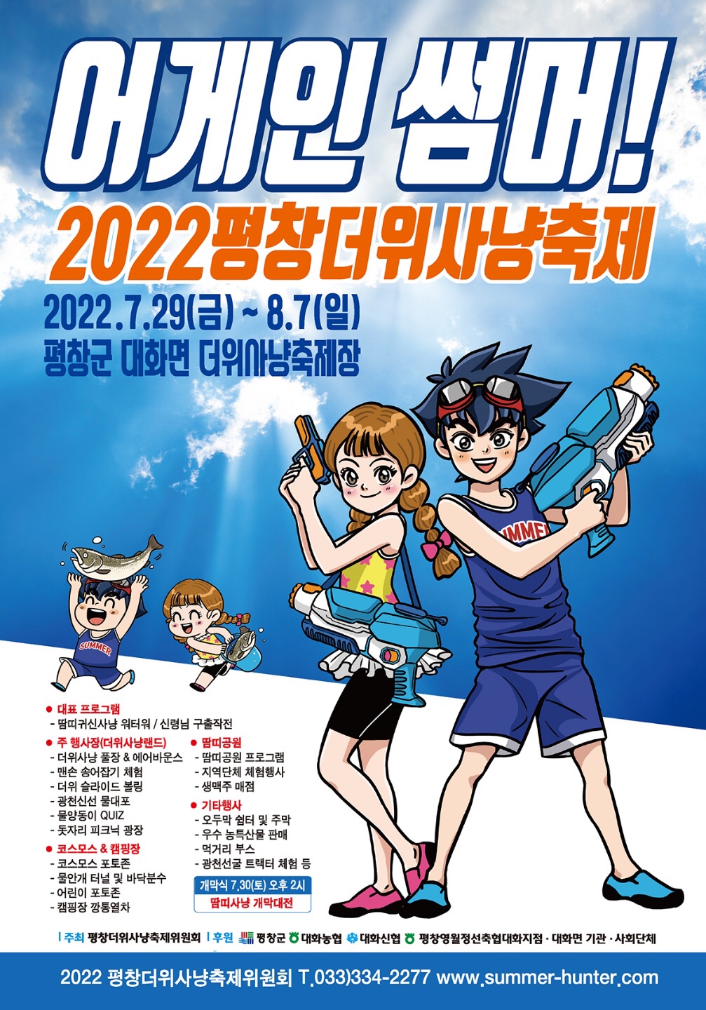 평창군 더위사냥축제위원회(마해룡 위원장)은 7월 29일부터 대화면 땀띠공원 일대에서 2022년 평창 더위 사냥 축제를 개최한다고 밝혔다. 올해로 9년째 이어오고 있는 명실상부한 평창군 대표 여