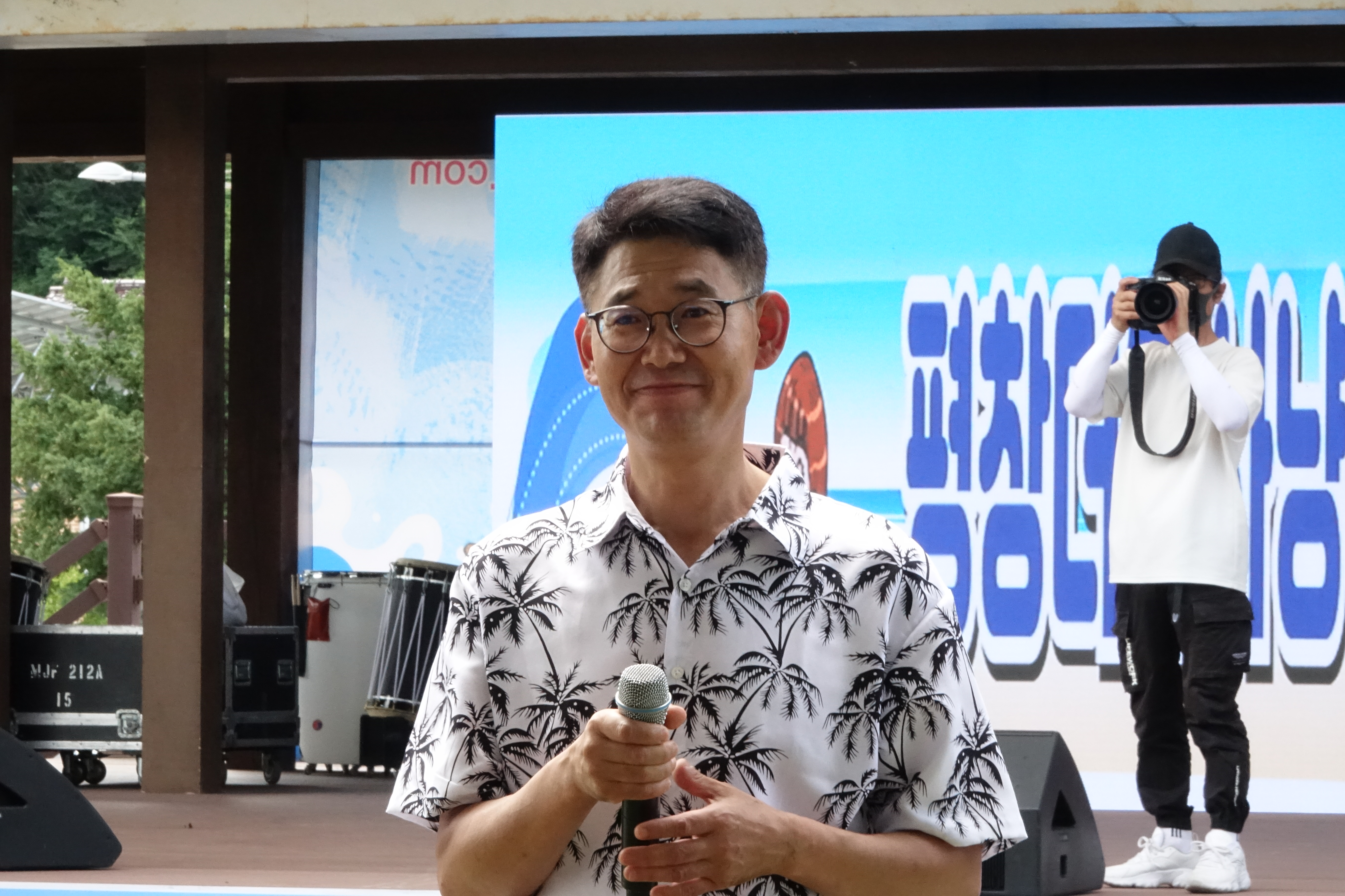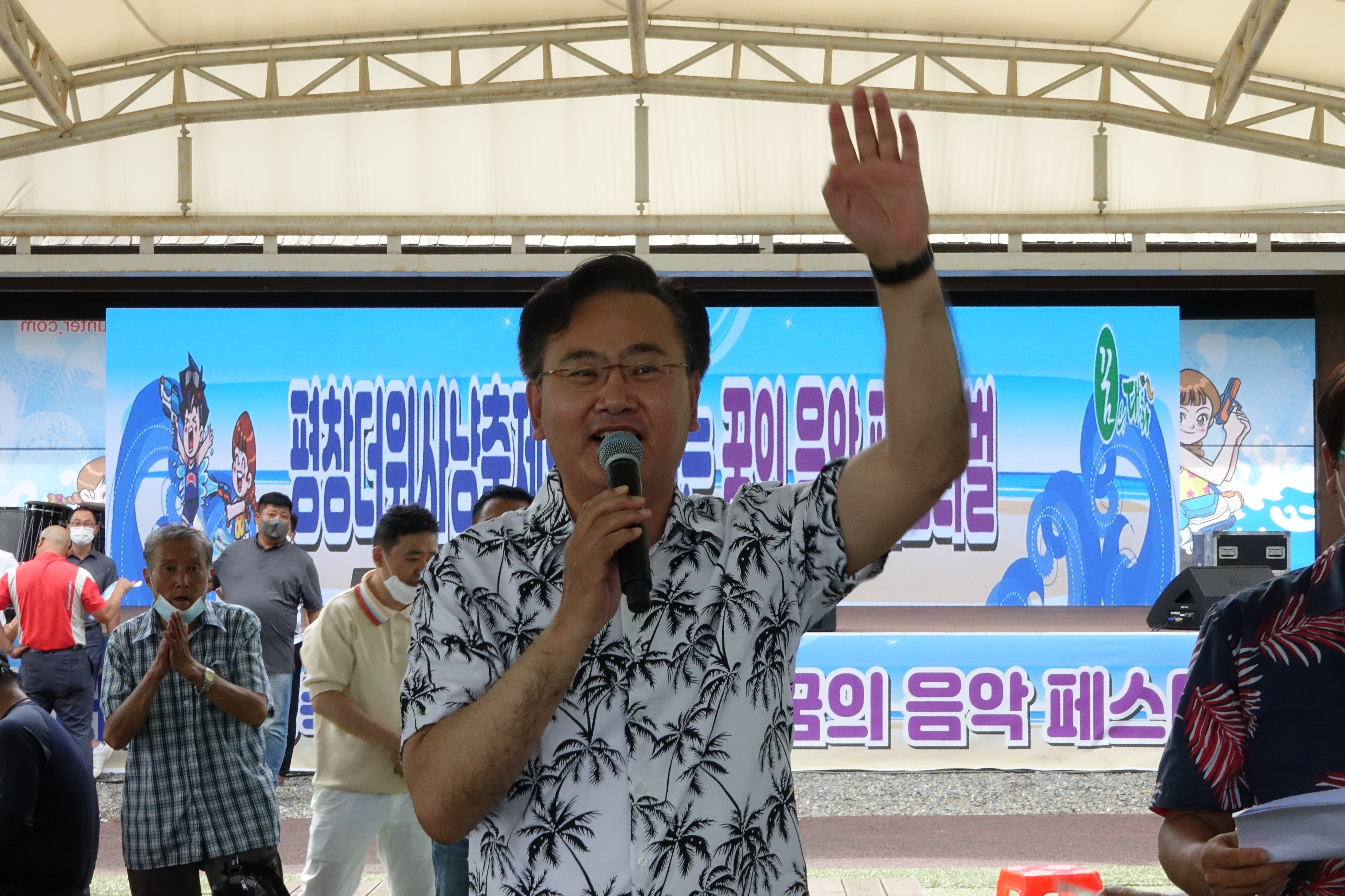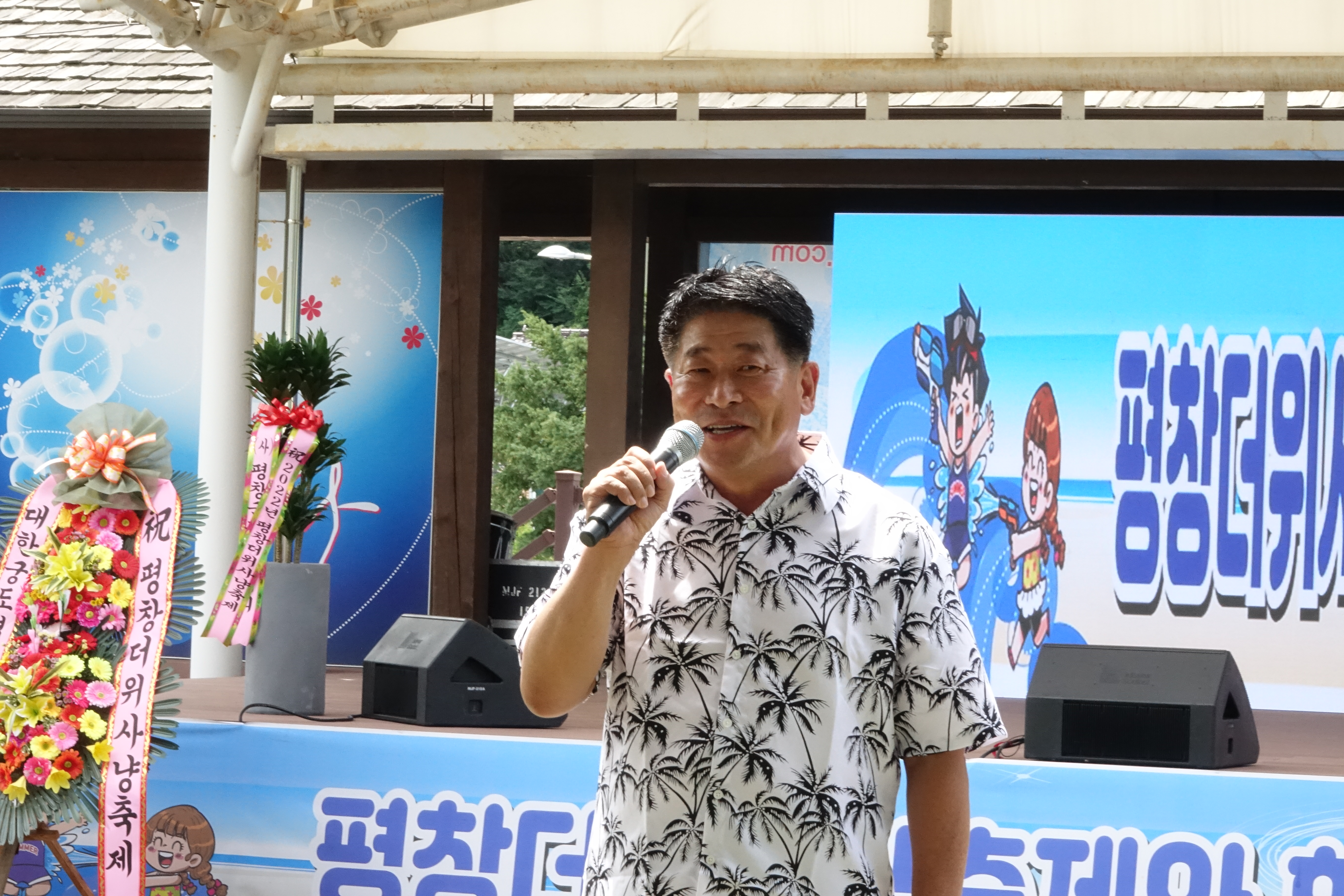 "평창더위사냥축제 즐거우시죠? 더위다 날리셨습니까? 대화면을 찾아와주신 대한민국 모든 국민들 환영합니다. 행복하게 보내세요 여러분 반갑습니다."라고 말했다.