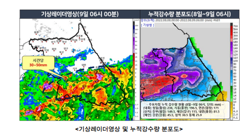 9일 오전 6시 기준  강원중.남부에는 돌풍과 천둥.번개를 동반한 시간당 30~50mm 비가 내리고 있다.  주요지점 누적 강수량은  (8일 00시부터 9일 06시 현재, 단위: mm) - 청일(횡성) 236.0 시동(홍천) 196.5 면온(평창) 171.0 부론(원주) 159.5 동송(철원) 158.0을 기록하고 있다.