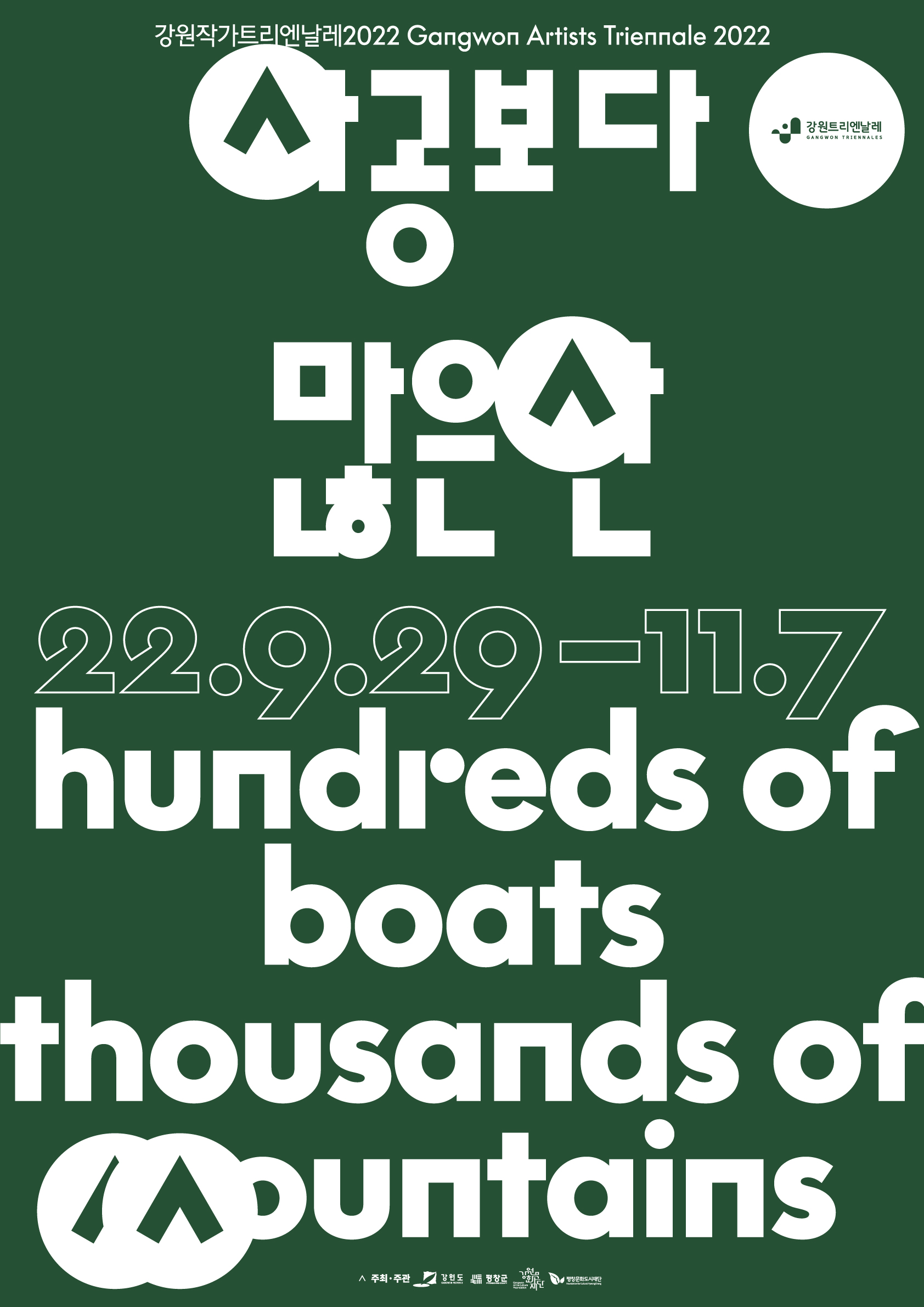 포스터 중앙에 고딕체로 자리 잡은 타이틀은 행사 주제인 ‘사공보다 많은 산(hundreds of boats, thousands of mountains)’의 한글과 영문활자체를 패턴화해 디자인 요소로 사용했다.
