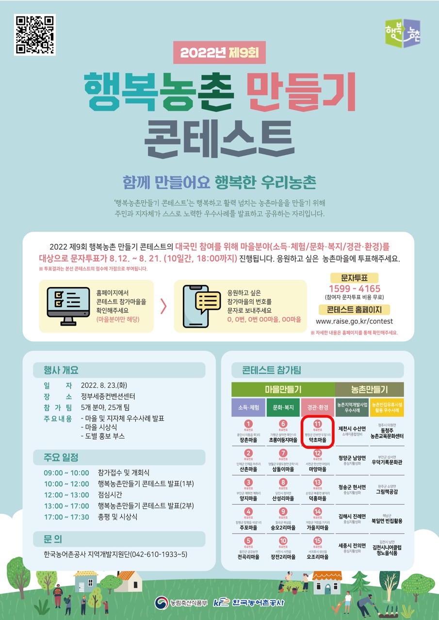 9월 최종 평가를 앞두고 마을만들기 분야 15개 마을을 대상으로,‘대국민 사전 문자투표’를 실시하여 투표 결과에 따라 최종평가에 가점을 부여하는데, 행복농촌 콘테스트 홈페이지(www.raise.go.kr/contest)에서 자세한 내용과 마을소개 영상을 확인할 수 있고, 문자투표는 오는 21일 오후 6시까지로, 약초마을에 문자 투표하려면 1599-4165(무료)로 ‘11’ 또는 ‘11번’ 또는 ‘11번 약초마을’또는 ‘약초마을’이라고 문자를 보내면 된다.
