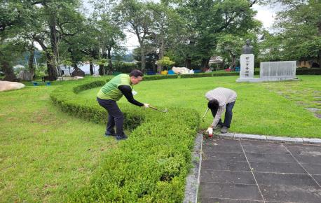 24일, 사단법인 평창군정원사 운영위원회(회장 신광순) 회원 14명은 봉평면 가산공원 및 효석문화제 축제장 일원에서 장마철 무성히 자라난 잡초를 제거하고 들쑥날쑥한 모습으로 미관을 해치는 조경수목 가지치기를 통해 깔끔하고 정돈된 공원을 조성하였다.