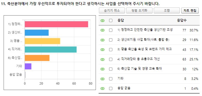 평창 신문 설문조사 목록 중 축산분야에서는 청정하고 안전한 축산물 생산 기반 조성을 가장 먼저 투자되어야 한다고 응답한 사람이 가장 많은 것으로 나타났다.