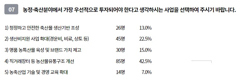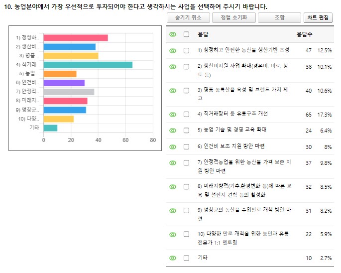 농업 분야에서 가장 먼저 투자되어야 한다고 생각하는 사업에 평창군 설문조사와 평창 신문 자체 설문조사 모두에서 직거래장터 등 농산물 유통구조 개선에 가장 많이 투자되어야 한다고 응답했다.