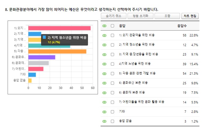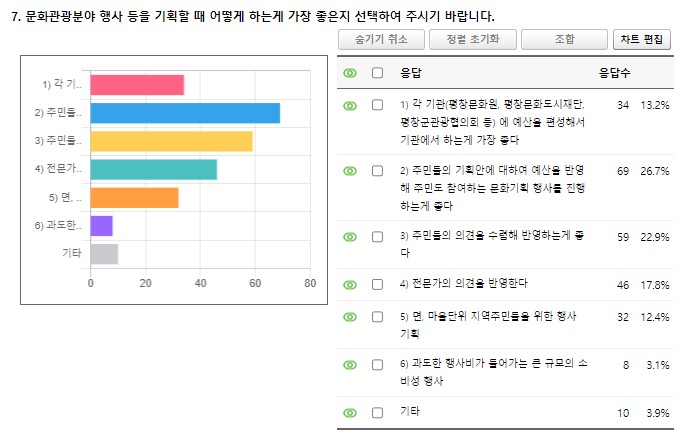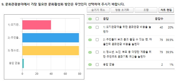 먼저, 문화관광 분야에서 가장 많이 쓰이는 예산은 무엇이라고 생각하는가에 대해서는 외지 관광객을 위한 비용, 각종 문화 관련 개발 비용이 높다고 응답한 사람이 높은 것으로 나타났다. 반면 어린이와 지역의 청소년을 위한 예산이 가장 적게 씌여진다고 응답한 사람이 많았다. 문화관광 분야 행사 등을 기획할 때는 어떻게 하는 게 가장 좋은가에 대한 질문에서는 주민들의 기획안에 대하여 예산을 반영해 주민도 참여하는 문화기획 행사를 진행하는 게 좋다는 의견이 가장 많았다. 문화관광분야 행사 등을 기획할 때 주민들의 의견을 수렴해 반영하는 게 좋다는 의견도 두 번째로 많았다. 문화관광 분야에서 가장 필요한 문화 활성화 방안에 대해서는 주민들이 보고 듣고 즐길 수 있는 면, 마을 단위 문화관광 비용을 늘린다. 청소년, 노인, 학부모 등 다양한 계층을 위한 주민주도 문화기획 예산을 늘린다는 의견이 가장 많았다.