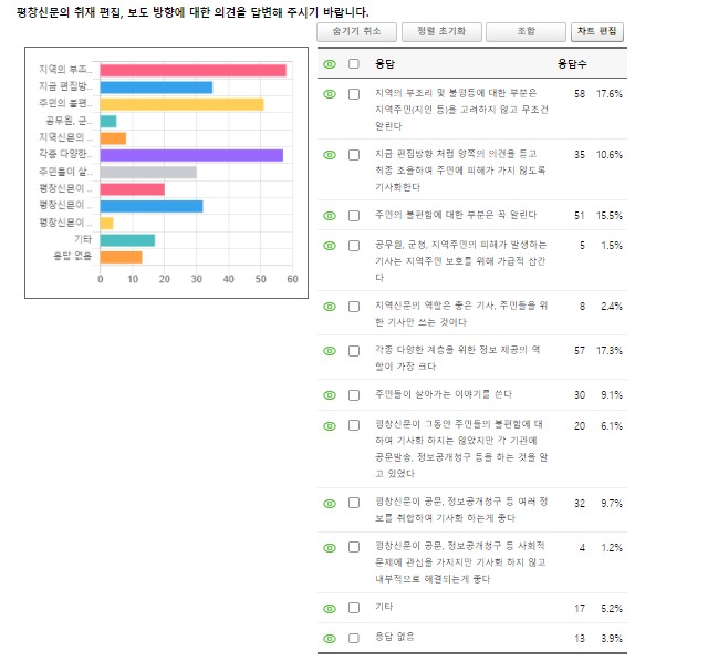 평창 신문의 취재 편집, 보도 방향에 대해서는 지역의 부조리 및 불평등에 대한 부분은 지역주민(지인 등)을 고려하지 않고 무조건 알린다. 주민의 불편함에 대한 부분은 무조건 알린다, 각종 다양한 계층을 위한 정보 제공의 역할이 가장 크다 세 가지 항목에 응답한 주민이 가장 많았다.
