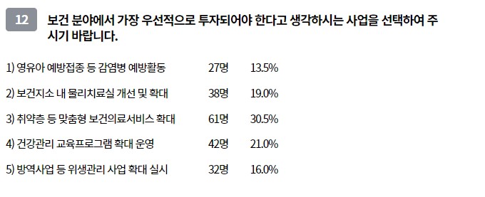 보건 분야에서 가장 먼저 투자되어야 한다고 생각하는 사업에 대해서는 평창군 설문조사에서는 취약층 등 맞춤형 보건의료서비스 확대에 61명이 응답했으며 평창군 설문조사에서는 평창군 설문조사에 없는 항목 중 영아부터 노년까지 이용할 수 있는 종합병원설립, 전문의가 있는 전문진료와 신설, 응급실 응급 전문의 확충이 가장 높게 나타났다.