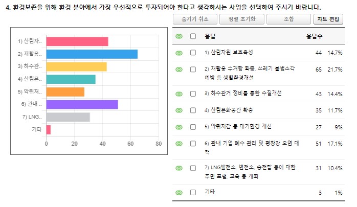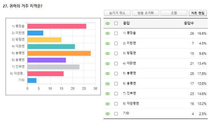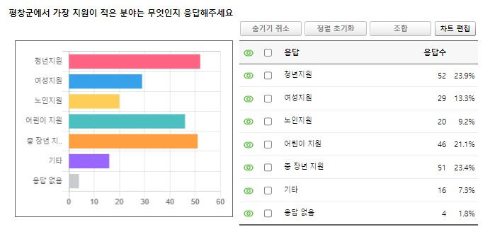 평창 신문에서는 평창군 설문조사에서는 없지만 다양한 분야에 대해서 주민들의 의견을 좀 더 알아보기 위해 몇 가지 설문 목록을 추가해서 주민들의 의견을 들어 보았다.