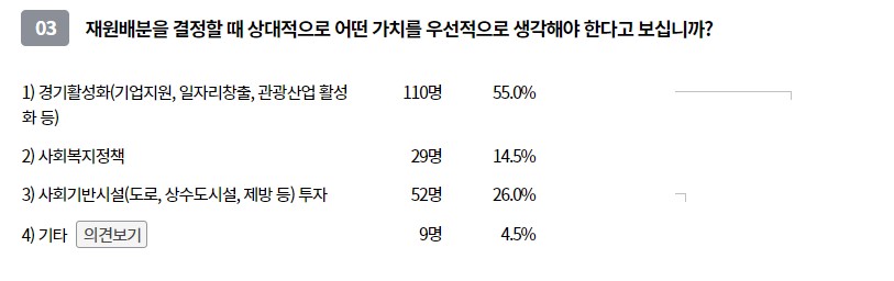 재원 배분을 결정할 때 상대적으로 어떤 가치를 먼저 생각하는가에 대한 질문에는 평창군, 평창 신문 설문조사 모두 경기 활성화(기업지원, 일자리 창출, 관광산업 활성화 등)에 110명, 86명으로 가장 많이 응답한 것으로 나타났다.