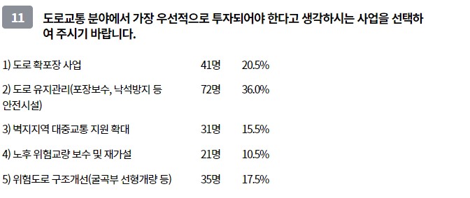 - 병원, 평생학습관, 사회복지관 등 기초생활인프라 확충을 위해 우선적 투자 요구 한목소리
