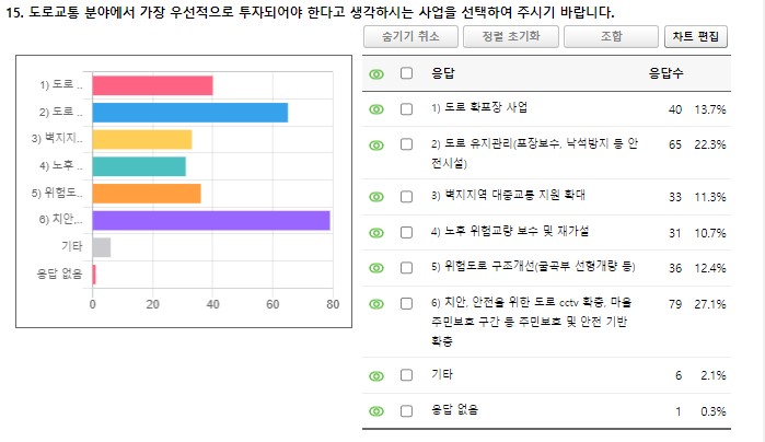 이번 설문조사는 23년도 예산편성 방향 설정 및 분야별 투자 우선순위 설정에 기초 자료로 활용하기 위한 것입니다. 특정 사업 및 세부적인 사항은 예산편성에 앞서 정책 결정 단계가 우선되어야 할 사항으로 보여집니다. 또한 설문조사와 별도로 생활 속 불편함 등에 대해 군민이 예산편성에 의견을 낼 수 있는 “주민 의견 제안하기”를 군 홈페이지를 통해 운영하고 있습니다.