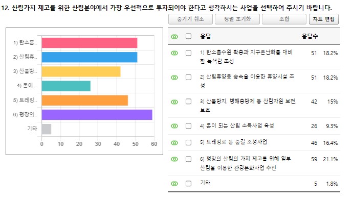 산림 가치 제고를 위한 산림 분야에서 가장 먼저 투자되어야 한다고 생각하는 사업에 대해서는 평창군 설문조사에서는 산림휴양 등 숲속을 이용한 휴양시설 조성이 가장 많았고, 평창 신문 설문조사에서는 평창의 산림 가치 제고를 위해 일부 산림을 이용한 문화관광사업 추진을 가장 우선 투자해야 한다고 응답한 사람이 가장 많았다.