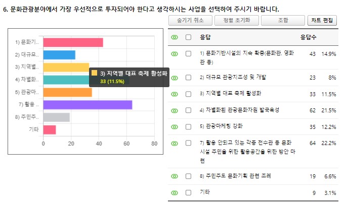 먼저, 문화관광 분야에서 가장 많이 쓰이는 예산은 무엇이라고 생각하는가에 대해서는 외지 관광객을 위한 비용, 각종 문화 관련 개발 비용이 높다고 응답한 사람이 높은 것으로 나타났다. 반면 어린이와 지역의 청소년을 위한 예산이 가장 적게 씌여진다고 응답한 사람이 많았다. 문화관광 분야 행사 등을 기획할 때는 어떻게 하는 게 가장 좋은가에 대한 질문에서는 주민들의 기획안에 대하여 예산을 반영해 주민도 참여하는 문화기획 행사를 진행하는 게 좋다는 의견이 가장 많았다. 문화관광분야 행사 등을 기획할 때 주민들의 의견을 수렴해 반영하는 게 좋다는 의견도 두 번째로 많았다. 문화관광 분야에서 가장 필요한 문화 활성화 방안에 대해서는 주민들이 보고 듣고 즐길 수 있는 면, 마을 단위 문화관광 비용을 늘린다. 청소년, 노인, 학부모 등 다양한 계층을 위한 주민주도 문화기획 예산을 늘린다는 의견이 가장 많았다.
