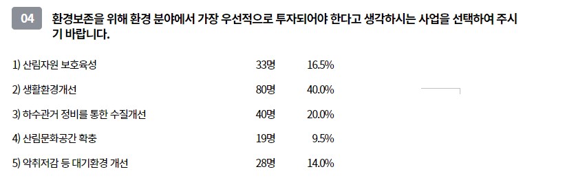 환경보존을 위해 환경 분야에서 가장 먼저 투자되어야 하는 분야에 대한 응답으로 평창군 설문조사에서는 생활환경개선에 80명으로 가장 많았고, 평창 신문 자체 조사에서도 생활환경개선사업의 일환으로 재활용 수거함 확충, 쓰레기 불법 소각 예방 등 생활환경 개선에 가장 많은 응답을 보였으며 두 번째로 많이 응답한 부분은 관내 기업 폐수 관리 및 평창강 오염대책에 많이 응답한 것으로 나타났다.