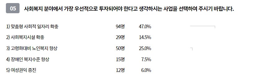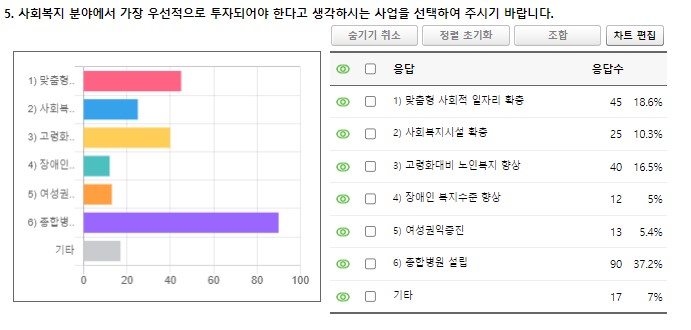 사회복지 분야에서 가장 먼저 투자되어야 한다고 생각하는 사업에는 평창군 설문조사에서는 맞춤형 사회적 일자리 확충이 94명으로 가장 많았고, 평창군 설문조사 목록에는 없었지만 평창 신문에서 추가한 자체 설문 목록에서는 종합병원 설립이 90명으로 가장 많은 것으로 나타났다.