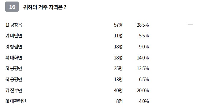 평창 신문에서는 평창군 설문조사에서는 없지만 다양한 분야에 대해서 주민들의 의견을 좀 더 알아보기 위해 몇 가지 설문 목록을 추가해서 주민들의 의견을 들어 보았다.