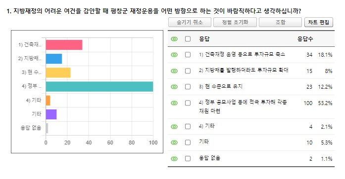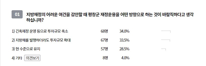 먼저, 평창군과 평창 신문의 설문조사 결과를 살펴보면, 첫 번째 질문이었던 평창군 설문조사에서 지방재정의 어려운 여건을 감안할 때 평창군 재정 운용을 어떤 방향으로 하는 것이 바람직하다고 생각하는가에 대한 질문에 평창군 설문에서는 긴축재정 운영 등으로 투자 규모 축소, 지방채를 발행하더라도 투자 규모 확대가 각각 68명, 67명으로 비슷하게 나타났는데 평창 신문이 설문 목록을 추가해 자체적으로 실시한 투표에서는 평창군이 정부 공모사업 등에 적극 투자해 각종 재원을 마련하면 좋겠다는 의견에 100명이 응답해 각종 재원 마련을 위한 공모사업 신청 등을 많은 주민이 원하고 있는 것으로 나타났다.