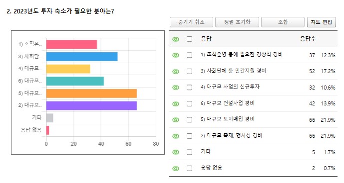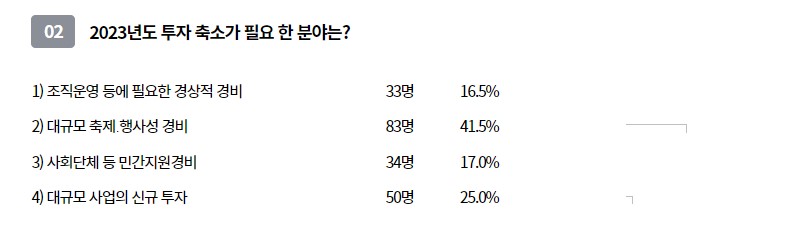 23년도 투자 축소가 필요한 분야에는 평창군 조사 결과에서는 대규모 축제, 행사성 경비를 축소하자는 의견이 83명으로 가장 많았고 평창 신문 자체 설문조사에서도 대규모 축제, 행사성 경비가 66명, 추가 설문 목록 중 대규모 토지매입 경비가 66명으로 많이 나타났다.