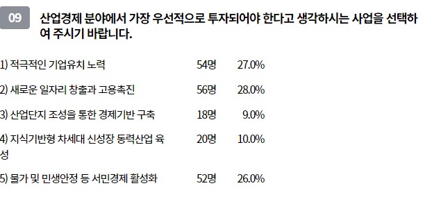 재원 배분을 결정할 때 상대적으로 어떤 가치를 먼저 생각하는가에 대한 질문에는 평창군, 평창 신문 설문조사 모두 경기 활성화(기업지원, 일자리 창출, 관광산업 활성화 등)에 110명, 86명으로 가장 많이 응답한 것으로 나타났다.